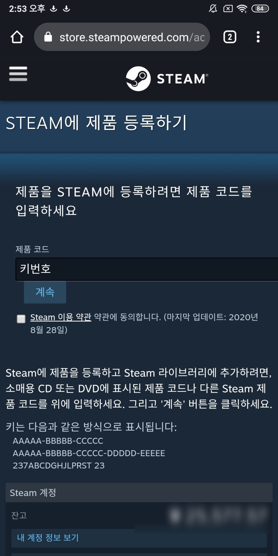 스팀어플내에서도 키등록은 안보이더라구요..